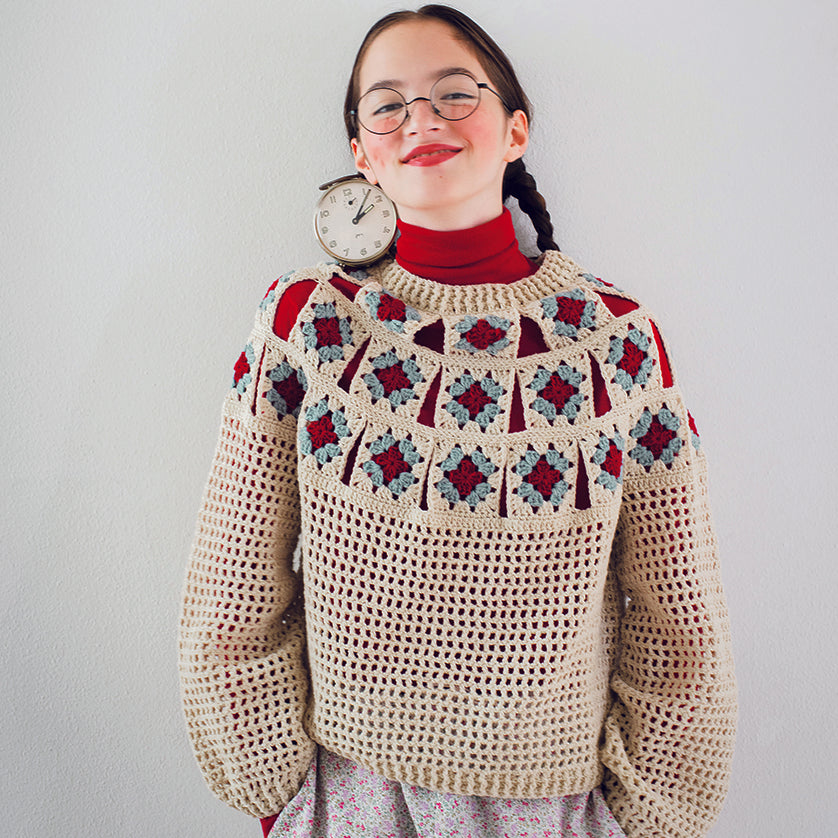 かぎ針編みを始めた人がまずは練習に、とすすめられるのが、この「グラニースクエア」。皆さんが最初に編む、この基本のモチーフが編めれば、セーターも編めちゃうよ、と言えるセーターをつくりたいなあと思ってデザインしました。四角いモチーフの隙間はそのまま残したので、難しい作業はほとんどありません。このスケスケのおかげで、合わせるアンダーで印象が変わる、楽しいウェアになりました。