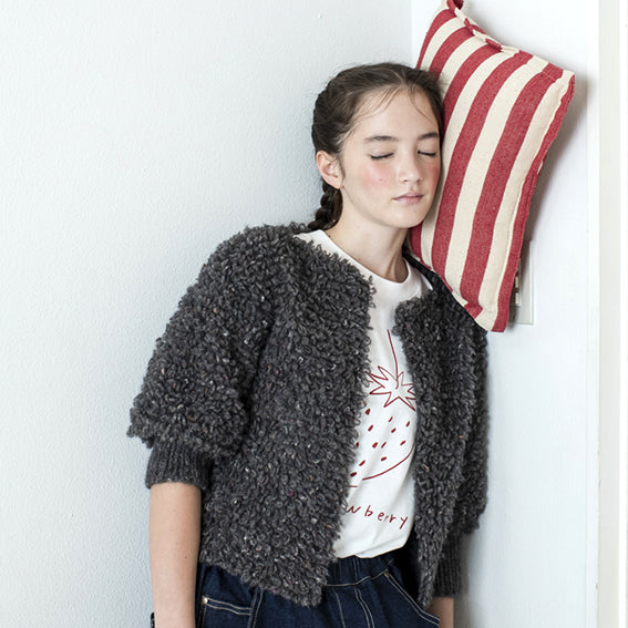 この本では赤の他に、チャコールカラーも編んでみました。もけもけ+可愛いカラーネップのおかげで、おとなしい色でもちゃんと主張があり、羽織るだけでいつものコーディネートをグッとおしゃれにしてくれます。カラーネップもさすがROWAN、色も量も、おしゃれさが際立つ素敵な糸です。